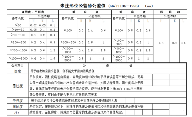 为简化制图,对一般机床加工就能保证的形位精度,不必在图样上注出形位公差,形位未注公差按GB/T 1184-1996的规定执行。大致内容如下: