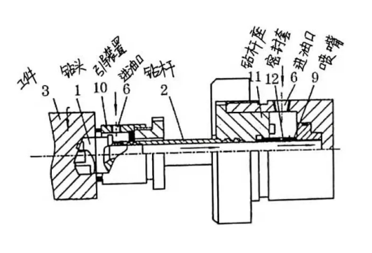 枪钻系统的工作原理:切削液通过尾架上的输油入口进入钻杆内部,到达钻头头部进行冷却润滑,并将切屑从钻头外部V型槽中排出,该系统主要用于小直径(孔径小于20mm)的深孔加工。