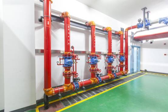 The fire pump room valve heights the same height, the paint is evenly painted, and the pipeline is rowed.